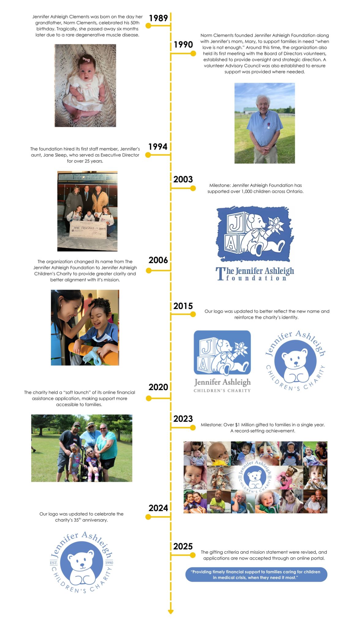 On a winter evening in February 1990, Norm, his daughter-in-law Mary (Jennifer’s mom), and close friends, family and colleagues gathered to form the Jennifer Ashleigh Foundation. Their mission was clear: to honour Jennifer’s memory by providing financial support to families caring for seriously ill children, stepping in “when love is not enough.”